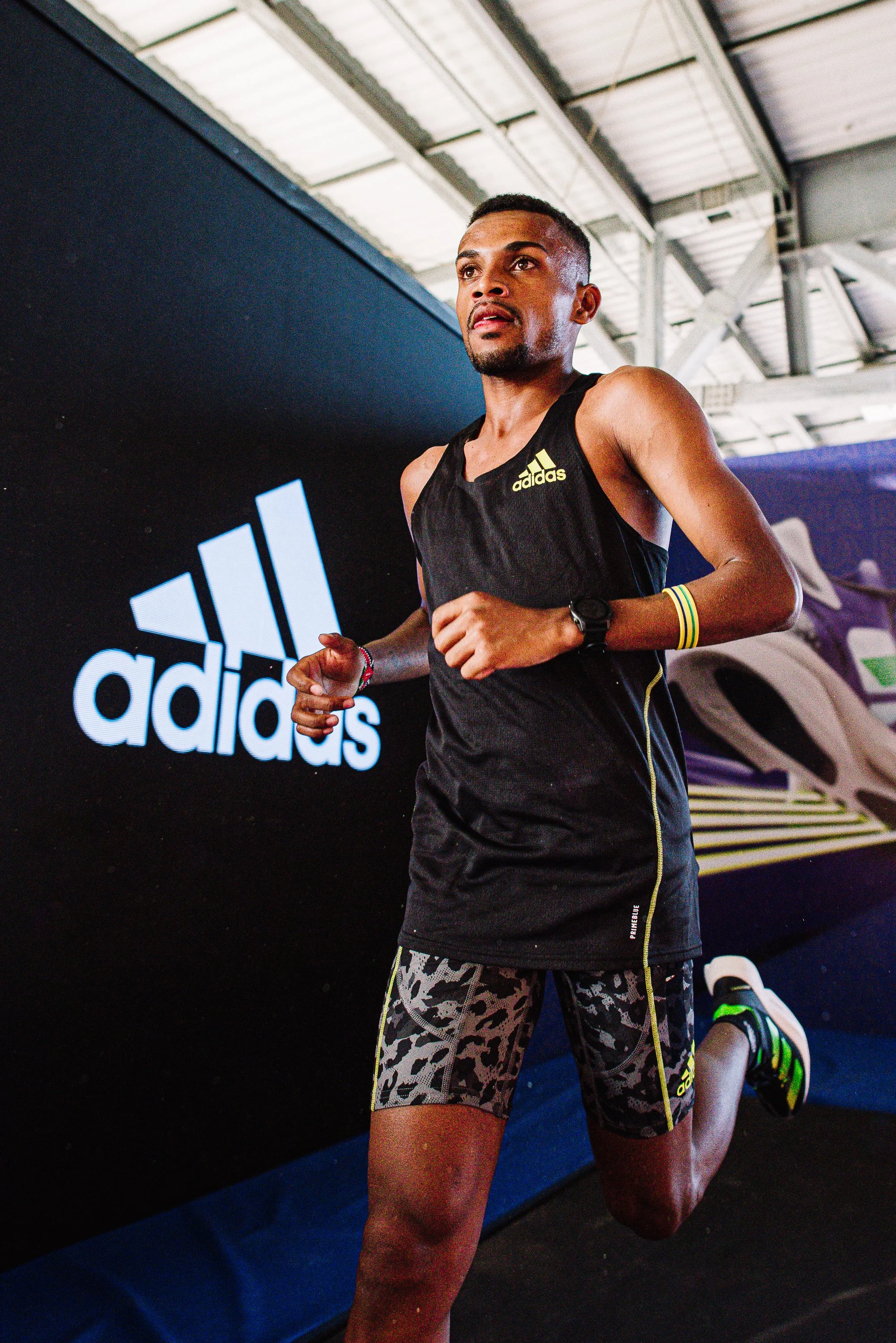 Uma esteira gigante que desafiava os corredores a calçarem o Adizero Adios Pro e correrem no pace da nossa estrela, Danielzinho.